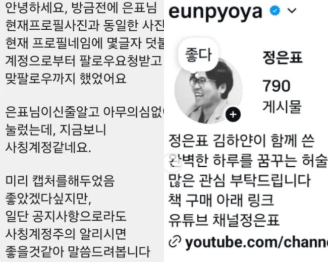 네티즌은 정은표에게 "방금 전에 은표님 현재 프로필 사진과 동일한 사진, 현재 프로필네임에 몇 글자 덧붙인 계정으로부터 팔로우 요청 받고 맞팔로우까지 했었다"라며 "은표님이신 줄 알고 아무 의심 없이 눌렀는데, 지금 보니 사칭 계정 같다. 미리 캡처를 해두었음 좋았겠다 싶지만, 일단 공지사항으로라도 사칭계정주의 알리시면 좋을 것 같아 말씀드려 본다"라고 권했다.
