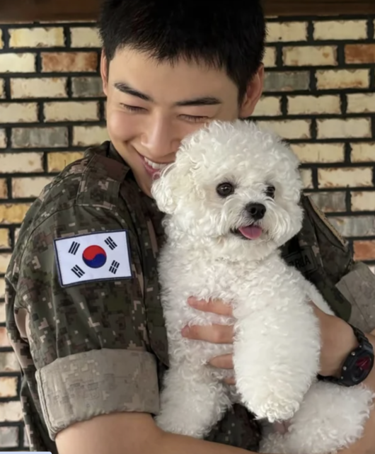 사진 속 차은우는 짧게 자른 군인 스타일 머리에도 불구하고 ‘얼굴 천재’다운 훈훈한 비주얼을 자랑했다. 특유의 환한 미소와 함께 반려견을 꼭 끌어안은 모습은 군인의 카리스마 속에서도 무장 해제된 듯한 다정함을 보여줬다.