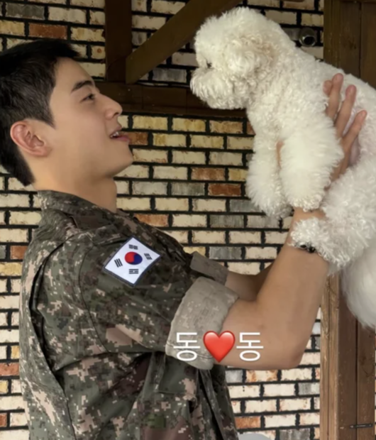 최근 소속사 측이 SNS를 통해 공개한 사진에는 군복을 입은 차은우가 반려견 ‘동동’을 품에 안은 모습이 담겼다.