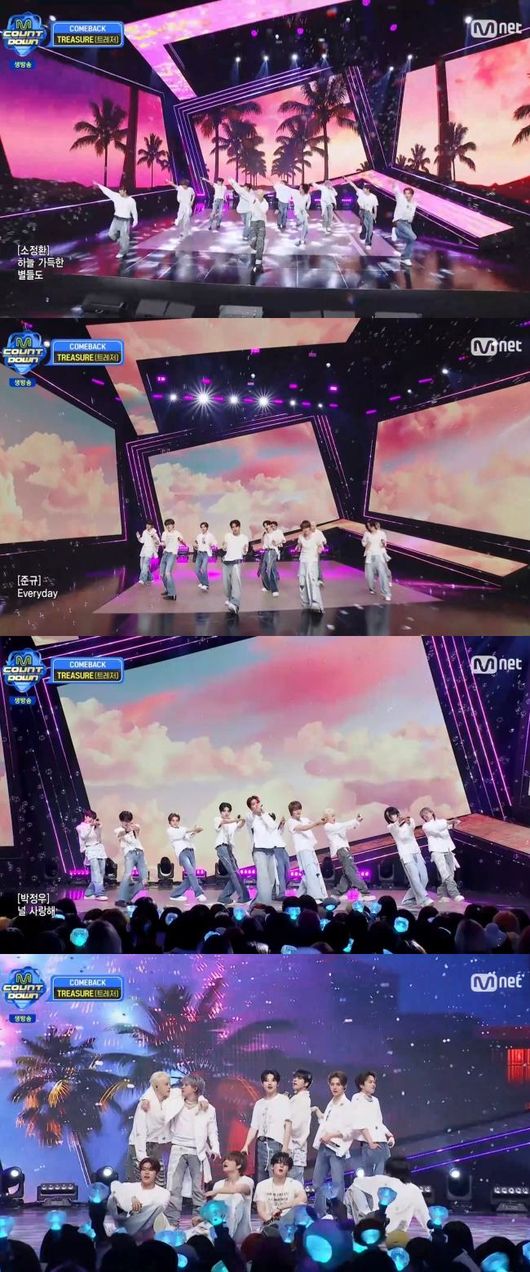 트레저는 지난 4일 오후에 방송된 케이블채널 Mnet '엠카운트다운'에 출연해 미니 3집 [LOVE PULSE] 타이틀곡 'PARADISE'와 수록곡 'EVERYTHING' 무대를 꾸몄다. 앞서 유튜브 '잇츠라이브', 댄스 퍼포먼스 비디오, 'a-nation 2025' 등을 통해 기대감을 예열한 만큼 이번 컴백 첫 음악방송 무대에 큰 관심이 쏠렸던 터.