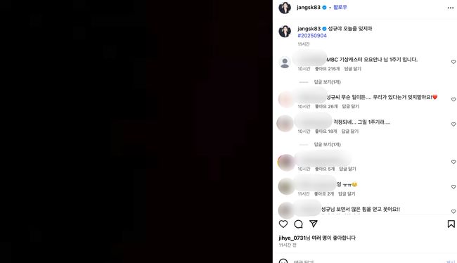 지난 4일 장성규는 자신의 SNS에 “성규야 오늘을 잊지마 20250904”라는 짧은 글과 함께 검은 배경의 사진을 게재했다. 별다른 설명이 없는 게시물에 팬들은 “무슨 일 있는 거냐”, “괜찮은 거냐”라며 우려를 나타냈다.