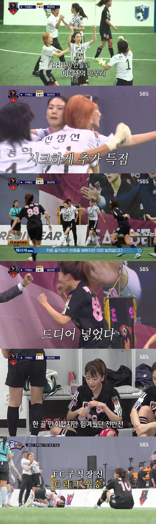 앞서 지난달 27일 방영된 ‘골때녀’에서는 FC구척장신과 FC원더우먼의 G리그 결승전이 공개됐다. 이날 구척장신은 이혜정과 김진경의 득점으로 2대 0으로 앞서갔고, 원더우먼 마시마가 만회골을 터트렸으나 경기는 2 대 1로 마무리됐다. 구척장신이 첫 리그 우승을 차지한 것.