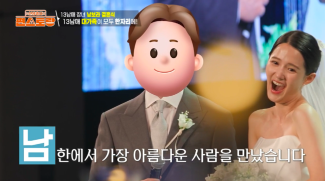 그런 가운데 13남매를 낳으신 어머니도 등장했다. 어머니를 본 패널들은 “어머니가 미인이시다”, “이목구비가 닮았다”라고 반응을 보였다. 이때 카메라를 든 동생은 “엄마 오늘 언니 시집 가는 날인데 어떠냐”고 물었고, 엄마는 “아직까지도 실감이 안 난다”라며 “가족보다 내가 1번인 그런 결혼생활 했으면 한다”라고 조언했다.