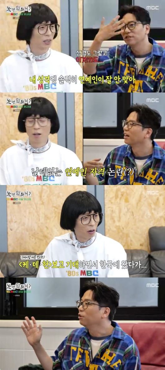 가장 먼저 도착한 사람은 가수 이적이었다. 유재석은 이적을 반갑게 맞으면서도 “최근에 ‘연예인이 내 일이 아닌 것 같다’는 이야기를 했냐”라고 물었다. 이적은 긍정하면서도 유재석에게 “형도 연예인과가 아니다. 성격도 그런데 얼굴도..”라고 디스해 웃음을 줬다.