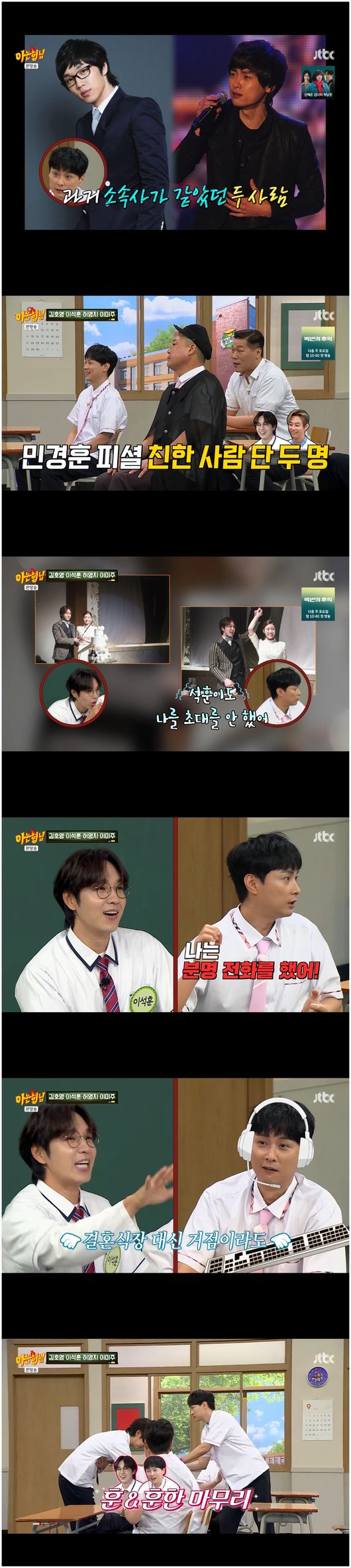 서장훈은 “이석훈은 민경훈의 몇 없는 절친 아니냐. 그런데 결혼식에 왜 안 왔냐”라고 물었다. 이석훈은 “이게 할 말이 있다. 민경훈이나 나나 서로 연락을 안 하는 편이다. 그런데 민경훈이 결혼할 때 연락이 없더라. 그래서 겹치는 친구인 테이는 민경훈 결혼식을 가더라. 그래서 나는 민경훈의 절친이 아닌 줄 알았다”라고 말해 모두를 놀라게 했다.