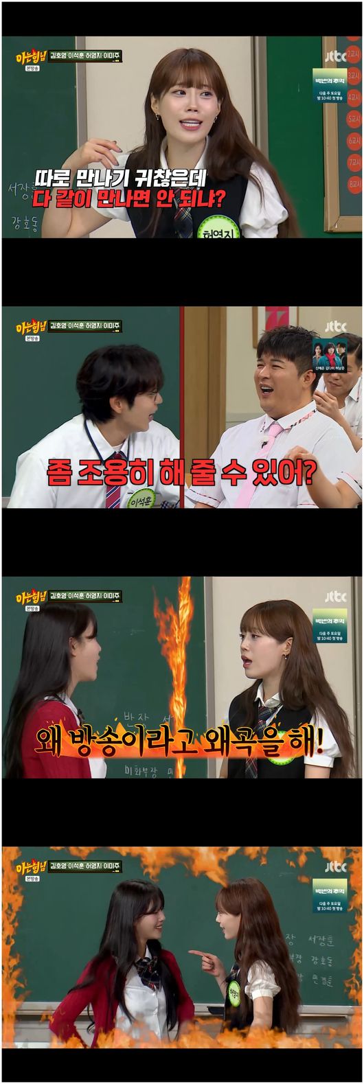 그러면서도 투닥거리는 건 멈추지 않았다. 허영지는 “그 후로 팀도 쉬고 그러면서 응원해주다가 몇 년 후에 미주한테 연락이 왔다”라고 말했고, 이미주는 “슬기, 영지, 효정이 다 따로 알아서 한 번 연락을 해서 모여서 놀자고 했다”라고 말했다. 이에 허영지는 “그때 이미주가 ‘야, 다 따로 만나는 거 귀찮은데 그냥 다 같이 만나면 안 되냐?’라고 했다. 너 왜 자꾸 방송이라고 왜곡을 해?”라며 다다다다 따졌다.