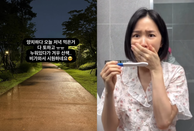 6일 초아는 자신의 소셜 계정에 "양치하다 오늘 저녁 먹은거 다 토하고ㅠㅠ 누워있다가 겨우 산책..비가 와서 시원하네요"라는 글을 올렸다.