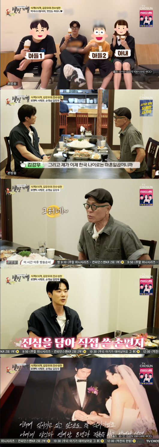김강우는 아내와 연예계 활동 전부터 8년간 교제했다고 밝히며, 올해 결혼 15주년을 맞은 그는 "아내와 인생의 반을 같이 있었다"고 말하며 변치 않는 애정을 드러냈다. 특히 김강우는 결혼 15주년을 기념해 아내에게 손편지를 썼다고 전해 감동을 더했다.