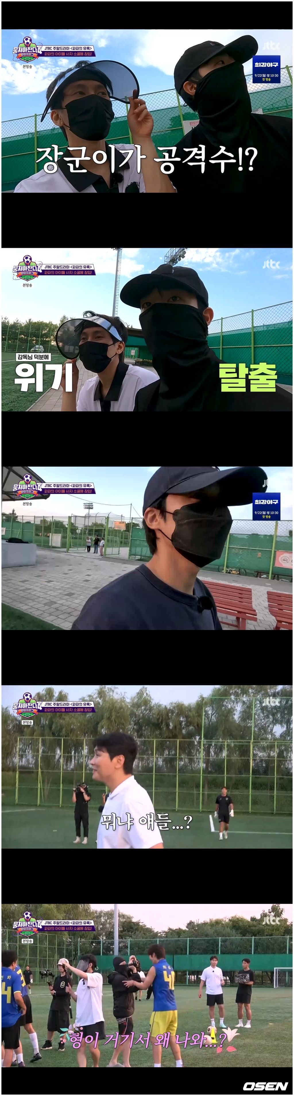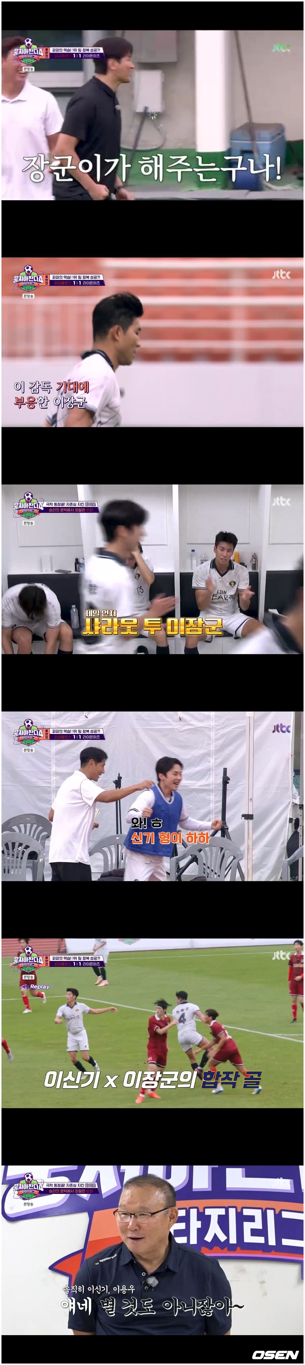 7일 방영한 JTBC 예능 '뭉쳐야 찬다4’에서는 박항서 감독의 FC파파클로스와 이동국 감독의 라이온하츠 FC가 맞붙었다. 파파클로스로서는 놀라울 정도로 일취월장했기에 1위 팀을 꺾고 싶어 한 가지 수를 냈다. 바로 라이온하츠가 연습하는 경기장을 간 것이었다. 이들은 모두 스태프처럼 바라클라바에 모자, 마스크 등으로 꽁꽁 감춘 채 고프로 카메라를 들고 그들의 전략 전술을 엿들었다.