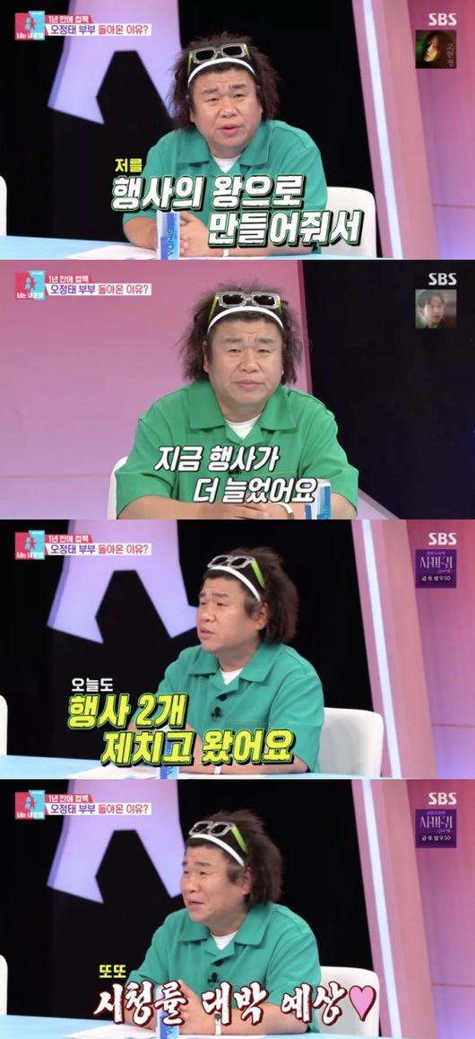 개그맨 오정태가 한 달에 최대 90개의 행사를 한다고 해 모두를 놀라게 했다.