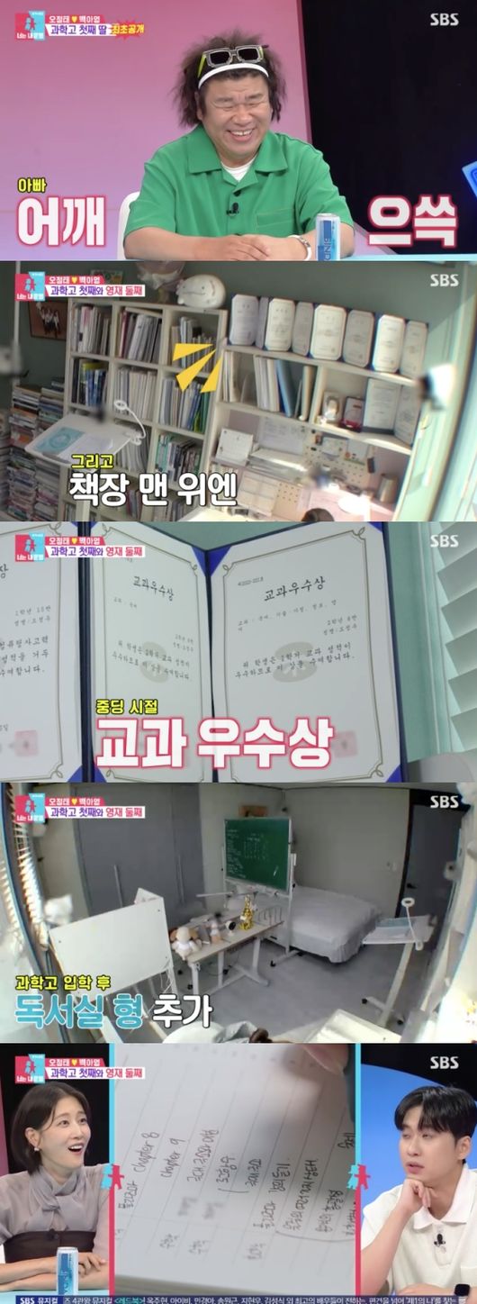 오정태는 “첫째는 (공부가) 좀 늦었다. 초등학교 4학년 때부터 열심히 달렸다. 큰딸이 초등학교 4학년 때 처음으로 1등을 했다. 학원 벽에 붙어 있었다. 그걸 유지하려고 열심히 한 것 같다”라고 설명했다. 백아영은 “아기 때부터 보드판이 항상 집에 있었다. 항상 설명하듯이 쓰면서 공부를 했다. 공부 효과가 있다더라”라고 덧붙였다. 오정태는 “생일 선물로 강의용 마이크를 사달라더라. 칠판 앞에서 마이크 차고 공부한다고”라고 첨언하기도.