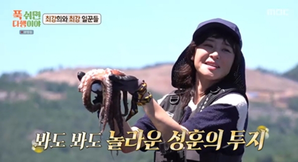 이때 박준형이 문어를 발견했고, 최강희는 물속에 직접 들어가 갈고리를 건넸다. 바닷속에 꼭꼭 숨은 문어를 잡기 위해 성훈도 출동했다. 응원을 보내는 최강희를 보며 “누나가 앞에서 응원해 주니까 빨리 잡아야 한다는 생각만 들었다”는 성훈. 그는 거친 바닷속에서 사투를 벌인 끝에 결국 대형 문어를 건져 올렸다.