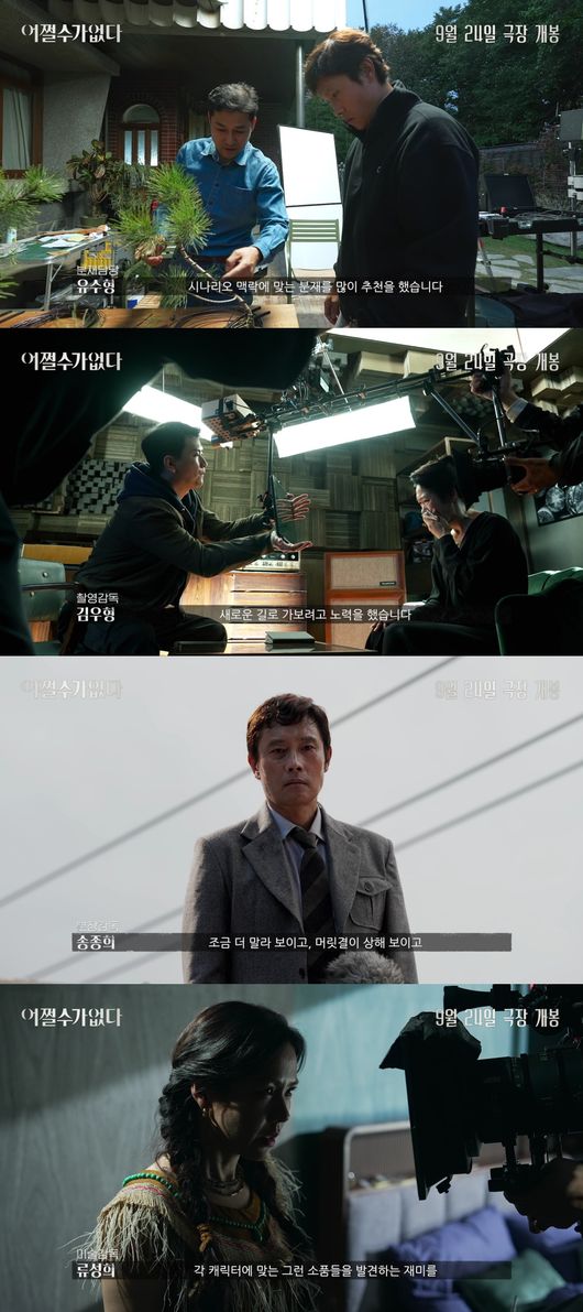 이어 촬영 기법에 대해 김우형 촬영감독이 “현실을 그대로 옮기는 것에 만족하지 않고, 새로운 길로 가보려고 노력했다”고 설명해, '어쩔수가없다' 만의 독창적인 영상미를 기대케 한다. 송종희 분장감독은 “고군분투하는 ‘만수’의 초조함을 표현하기 위해 말라 보이고, 머릿결이 상해 보이게 연출했다. 고통스러움을 보는 사람들한테 전달하고 싶었다”고 밝혀, 섬세한 손길이 닿은 입체적인 캐릭터를 예고한다.