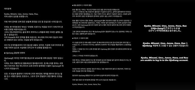 더군다나 이미 온라인 상에는 이부키가 매니저와 연인 관계이며, 두 사람이 함께 멤버들의 콘서트 출연료를 빼돌리기 위해 이면계약서를 요구했다가 제작사가 거절하자 현 상황에 놓인 것이 아니냐는 추측성 게시글이 확산되고 있었다. 이런 가운데 오죠갱 멤버 6인은 직접 입장문을 올리고 현 사태에 대한 설명에 나선 것.