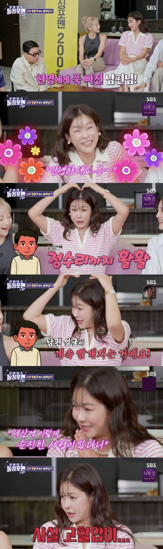 그러나 반전이 있었다. 현영은 “사실은 고혈압이 있더라. 집안 내력이 어르신들이 무슨 이야기만 하면 얼굴까지 빨개진다. (그걸 몰랐을 땐) 남편이 나를 이렇게까지 사랑하구나 생각했다”라고 덧붙여 웃음을 유발했다.