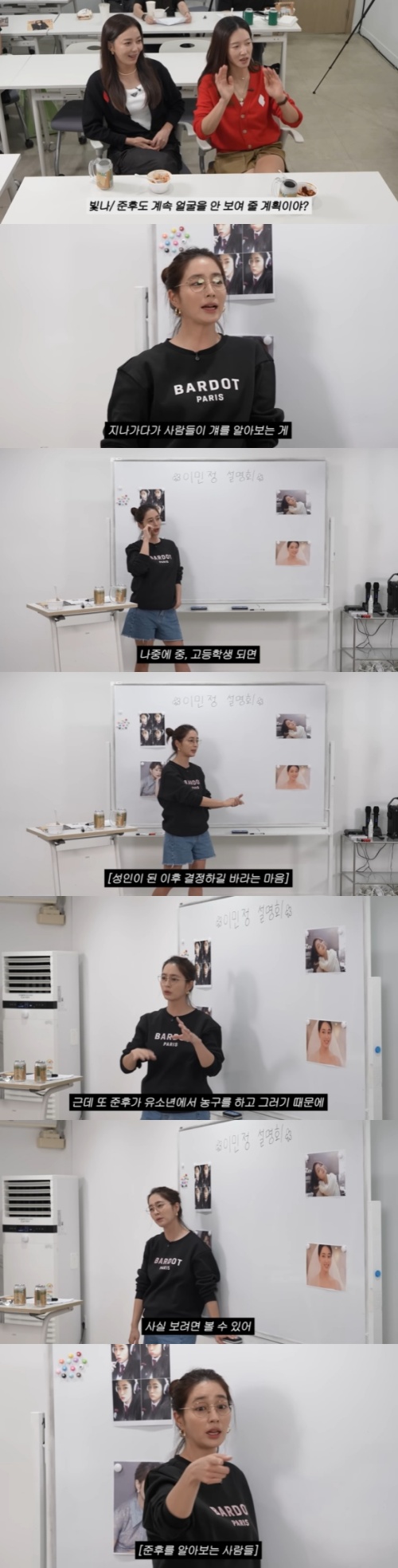 절친 왕빛나, 이소연은 "앞으로도 아들 준후의 얼굴을 계속 안 보여줄 계획이냐?"고 질문했고, 이민정은 "지나가다 사람들이 걔를 알아보는 게 지금은 잠시 신나고 좋을지 모르겠지만, 나중에 중, 고등학교쯤 되면 본인도 불편한 거고, 우리 아빠 얘기처럼 성인이 되고 나서 직업을 판단해야 될 테니까 그때 선택하는 게 나을 것"이라고 답했다.