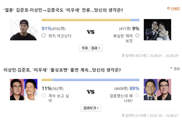 8일 포털사이트 네이트에는 ‘결혼’ 김준호·이상민→김종국도 ‘미우새’ 잔류…당신의 생각은?”이라는 제목의 여론 조사가 게재됐다. 조사 결과, 김종국을 비롯해 최근 결혼한 김준호, 이상민 등 이른바 ‘품절남’들의 출연이 “프로그램 취지에 어긋난다”는 응답이 전체 참여자 3,600여 명 중 91%를 차지했다. 반면 “재미 보장을 위해 잔류해야 한다”는 응답은 9%에 그쳤다. 이는 지난 7월, 이상민. 김준호의 결혼 후 프로그램 잔류 관련한 논란과도 이어진다.