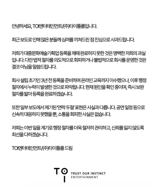 저희가 대중문화예술기획업 등록을 제때 완료하지 못한 것은 명백한 저희의 과실입니다. 다만 법적 절차를 의도적으로 회피하거나 불법적으로 회사를 운영한 것은 결코 아님을 말씀드립니다.