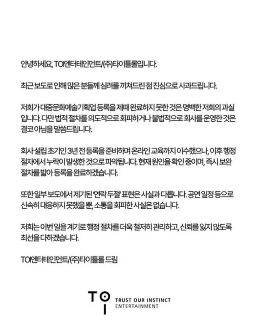 "최근 보도로 인해 많은 분들께 심려를 끼쳐드린 점 진심으로 사과드린다"라고 사과한 TOI엔터테인먼트 측은 "저희가 대중문화예술기획업 등록을 제때 완료하지 못한 것은 명백한 저희의 과실"이라고 시인했다. 다만 "법적 절차를 의도적으로 회피하거나 불법적으로 회사를 운영한 것은 결코 아니"라며 "회사 설립 초기인 3년 전 등록을 준비하며 온라인 교육까지 이수했으나, 이후 행정 절차에서 누락이 발생한 것"이라고 해명했다.