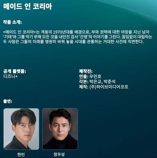 배우 현빈, 정우성 주연의 디즈니+ 신규 오리지널 시리즈 '메이드 인 코리아'가 공개 전부터 시즌2까지 확정돼 기대를 모으고 있다.