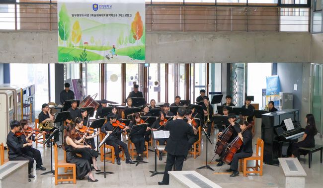 안양대학교 ‘아리필하모닉오케스트라(이하 아리필)’은 9일 일우중앙도서관 로비에서 장광수 총장과 이태섭 일우중앙도서관장, 성소영 입학처장, 백경원 음악학과 학과장, 김연경 교수, 최정현 교수, 사공유정 교수와 학생, 교직원 100여 명이 관람하는 가운데 창단 첫 음악회를 선보였다.