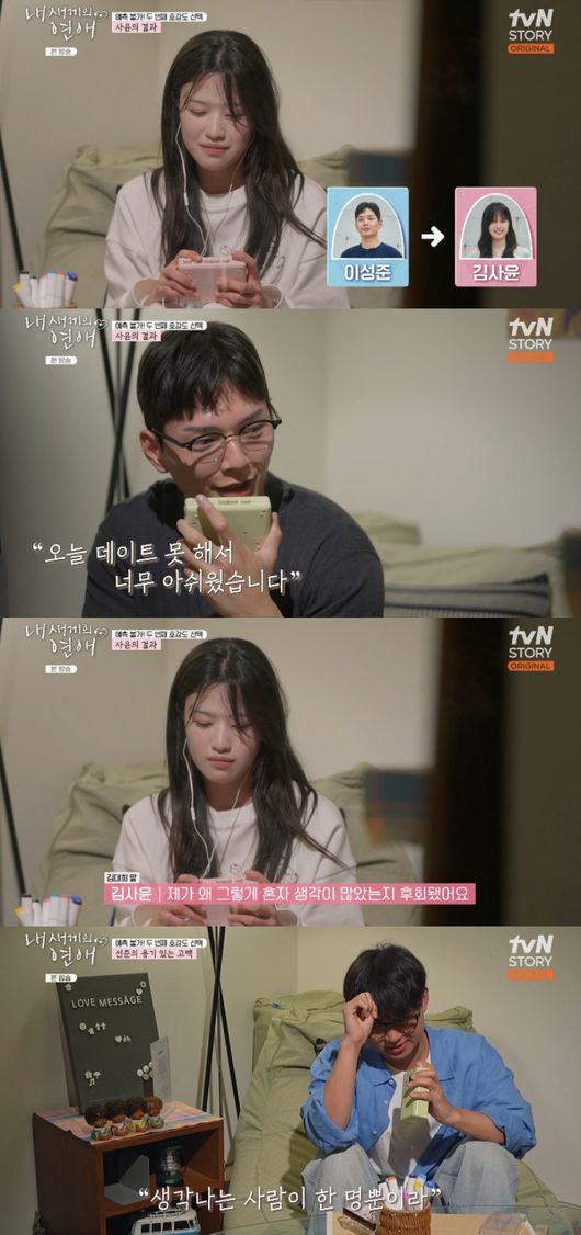 김사윤도 메시지룸을 확인했다. 첫 번째 메시지의 주인공은 다름 아닌 이성준이었고, 김사윤은 “일단 좋았고 그리고 제가 왜 그렇게 혼자 생각이 많았는지 후회됐다. 그럼 전 오늘 성준 님한테 안 보냈는데 조금 그래서 아 너무 생각 많이 하지 말고 그냥 보낼 걸 후회했다”라고 아쉬움을 드러냈다.
