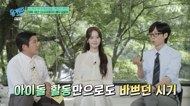 윤아는 소녀시대 데뷔보다 드라마 데뷔가 더 빨랐다며 “‘9회말 2아웃’이라는 드라마로 먼저 데뷔를 했다. 그 다음달에 소녀시대로 데뷔했다”고 했다. 이후에도 연기와 그룹 활동을 병행했다고. 윤아는 “그때 ‘너는 내 운명’ 촬영하면서 ‘Gee’ 활동을 했다. 잠을 못 잘 때도 많았고, 아마 제 기억에는 뮤직비디오 촬영할 때도 졸면서 찍으러 갔던 기억이 있다”고 했다.