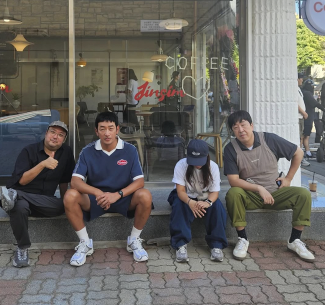 공개된 사진 속 하정우는 임필성 감독, 배우 현봉식 등과 함께 카페 앞에 앉아 여유로운 시간을 보내고 있다. 편안한 차림과 소탈한 모습이 눈길을 끈다.
