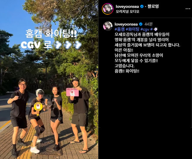 한편, 11일 오전 윤세아는 인스타그램을 통해 "오세호 감독님과 홈캠의 배우들이 영화 ‘홈캠’의 개봉을 널리 알리어 세상의 즐거움에 보탬이 되고자 합니다. 이른 아침!! 남산에 모여진 우리의 소망이 모두에게 닿을 수 있기를!! 고맙습니다. 홈캠!! 화이팅!!" 이라는 메시지와 함께 '홈캠'팀 러닝 인증샷을 게재했다. 배우 윤세아, 권혁, 김소민, 오세호 감독이 함께한 홈캠런은 좋은 기운이 가득한 남산에서 진행됐으며, '흥한 것이 찍혔다'라고 적힌 응원 피켓까지 준비하는 열정을 보였다.