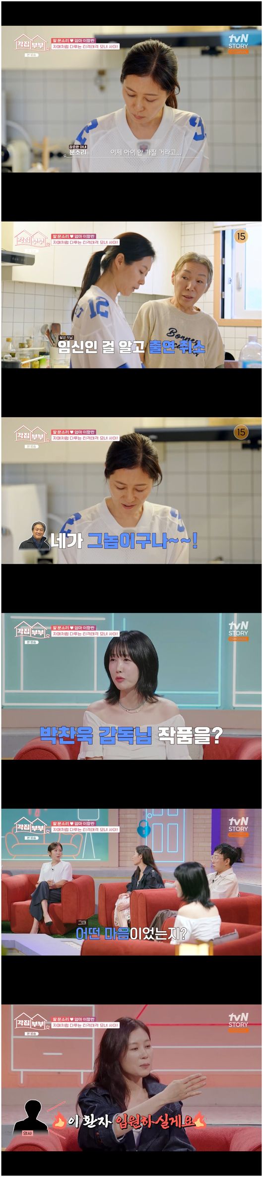 당시 문소리는 유산의 아픔을 추스르고 박찬욱 감독 작품에 들어가기로 결정이 됐었다. 촬영 첫날, 문소리는 임신 사실을 알게 됐다. 문소리는 “촬영 들어가면 안 되냐 물었다. 그런데 세 달 전에 유산을 했던지라, 절대 안정을 위해서 입원을 해야 했다. 기쁘면서도 그 작품을 위해서 준비했던 시기가 있어서 마음이 이상했다”라면서 아이를 사랑하는 한편 작품을 포기해야 했던 때를 떠올렸다.