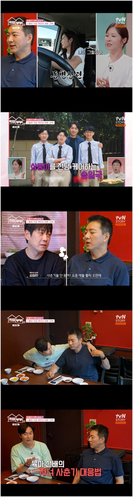 송일국은 “삼둥이들은 어깨동무만 해도 제 팔을 치운다”라며 삼둥이들의 사춘기를 전했다. 민윤기는 “안 그래도 김정민에게 물었더니 기다리라고 하더라”라며 팁을 전했다.