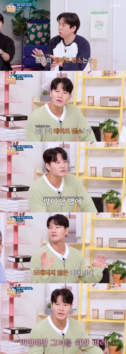 이어 김종국은 아내와의 데이트 장소에 대한 질문에 "많이 안 했다"고 답했다. 이에 김숙은 장난스럽게 "너 없지?"라고 말해 웃음을 안겼다. 김종국은 연애 기간이 오래되지 않았다고 덧붙였다.