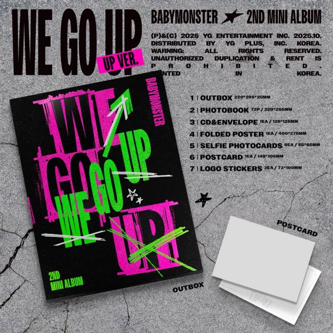 타이틀곡 'WE GO UP'은 베이비몬스터의 강렬한 에너지가 돋보이는 힙합곡이다. 곡 무드에 걸맞은 컨셉츄얼한 뮤직비디오가 예고된 데다, 이번 첫 티저 이미지부터 예사롭지 않은 분위기를 물씬 풍기는 만큼, 베이비몬스터가 이번 컴백으로 펼쳐낼 새로운 음악세계에 관심이 집중된다.
