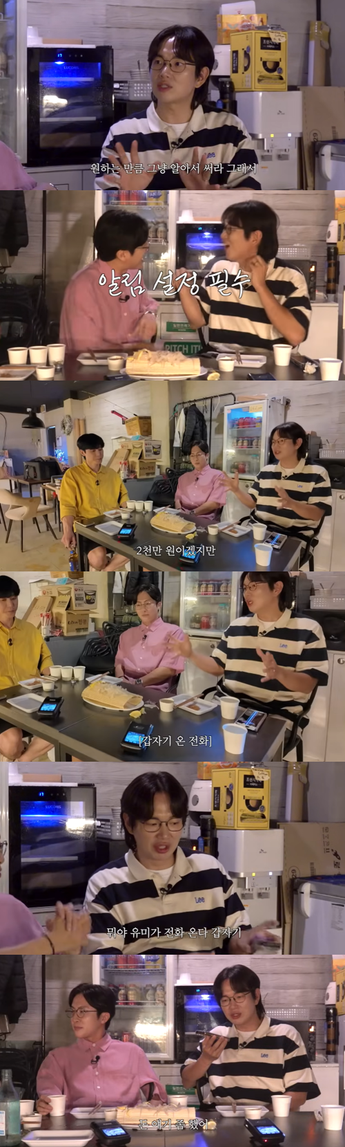 전민기는 "야! (문자 알림 서비스) 다시 해야 한다"고 했고, 그 순간 장성규의 폰으로 갑자기 아내의 전화가 걸려왔다. 장성규는 "유미가 전화 왔다. 지금 얘기하고 있는 거 알았나봐"라며 깜짝 놀라 웃음을 안겼다. 또 장성규는 "기가 막힌 게 유미 얘기할 때 전화가 왔다. 돈 얘기 좀 했다"고 털어놨고, 아내는 "하아"라고 한숨을 쉬어 주변을 폭소케 했다.