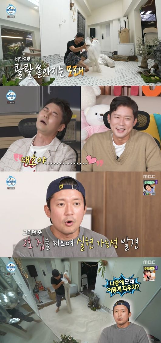 이날 김대호는 대호하우스 2호 거실 중정 바닥에 마른 나무들을 가지런히 놓고서는 빈틈을 메워 공간을 분리시켰다. 그리고 이내 20박스 모래를 거침없이 바닥으로 쏟아내 모두를 충격에 빠트렸다.