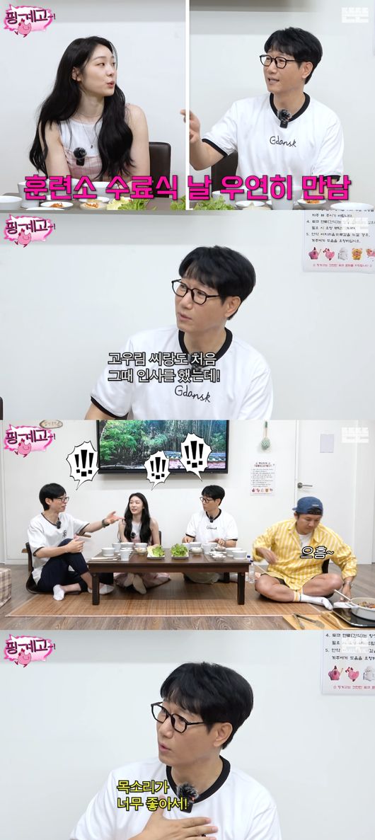 지석진은 "아들 훈련소 수료식 때 우림 씨랑도 처음 인사했다. 너무 놀랐다. 목소리가 너무 좋아서. '옛날부터 좋아했습니다'라고 하는데 목소리가 되게 낮고 좋더라"라며 깜짝 놀랐다.