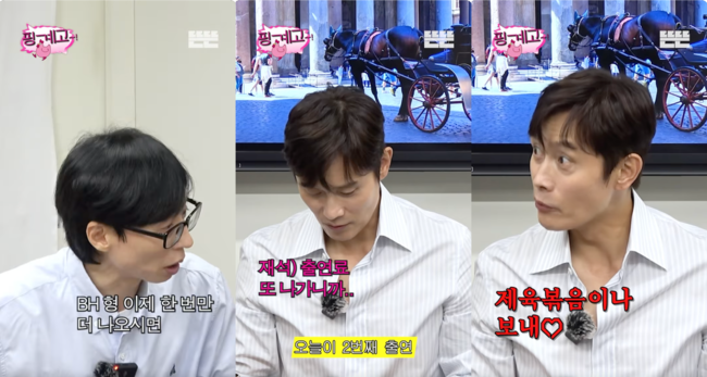 또한 이번 출연으로 이병헌은 2번째 출연을 하게 됐고, 한번 더 출연할 경우 ‘핑계고’ 출연료를 받을 수 있는 상황. 이를 유재석이 알리자 이병헌은 “제육볶음이나 보내”라고 전해 웃음을 안겼다.