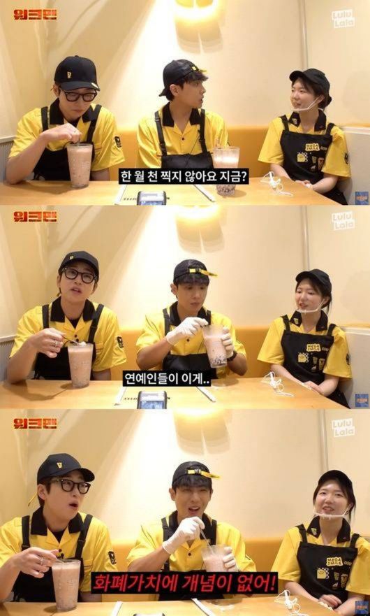 그 순간, 딘딘이 나섰다. "연예인들이 이게 문제다. 화폐가치에 대한 개념이 없다. 슈퍼카 타고 다니고, 제니 침대 쓰고 이러니까 정신이 나가서 그렇다"라고 말해 주위를 폭소케 한 것. 촬영 후반부에는 4시간 근무한 급여로 이준과 딘딘이 각각 4만 120원을 받자, 딘딘이 한번 더 이준에게 "이거 받고 보니 아까 형이 월급 1000만원 발언한 게 너무 경솔했다는 걸 다시 한번 알겠다"라고 말해 웃음을 더했다.