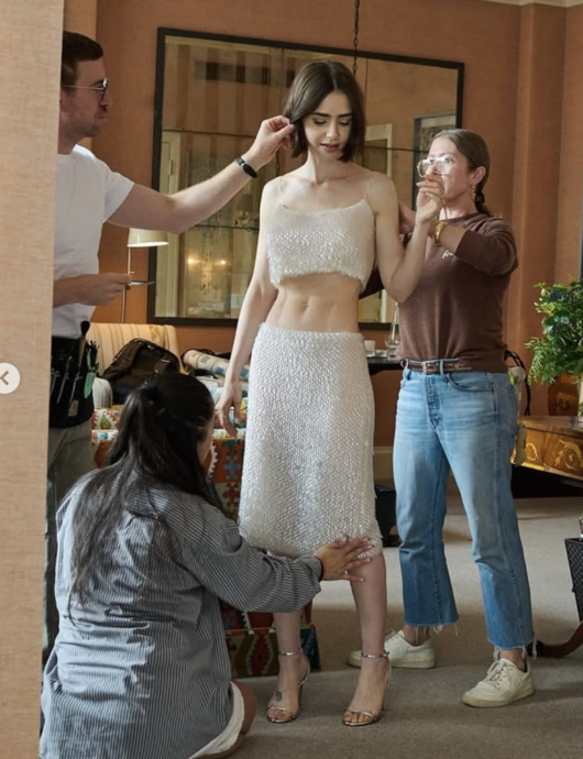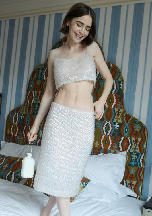 이번 착장은 칼빈 클라인의 뉴욕 패션위크 컬렉션으로, 스파게티 스트랩의 크롭 톱과 은빛 비즈 장식 스커트가 고급스러우면서도 섬세한 무드를 자아냈다. 릴리 콜린스는 미니멀하면서도 우아한 스타일링으로 ‘에밀리 인 파리’ 스타다운 패션 센스를 입증했다.