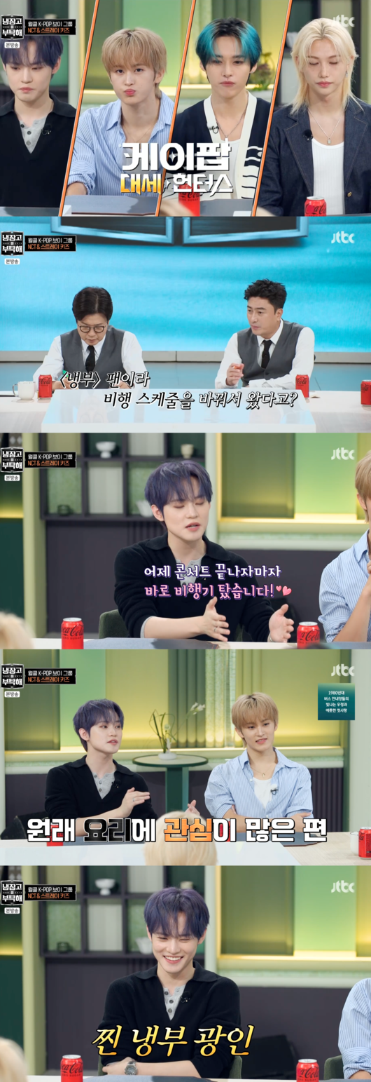 14일 전파를 탄 JTBC ‘냉장고를 부탁해’에서 NCT 천러·마크와 스트레이 키즈 리노·필릭스가 냉장고 주인으로 출연했다.