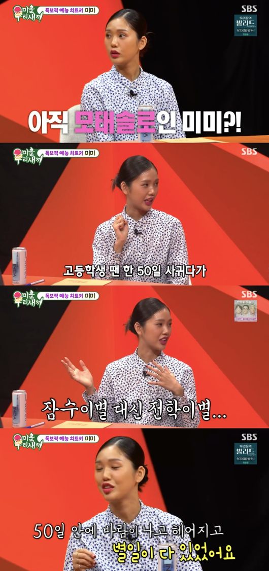 이날 미미는 모태솔로라고 밝혀 눈길을 끌었다. 그는 아직도 제대로 된 연애를 해 본 적이 없다며 “초등학교 2학년 때, 고등학교 1학년 때 연애 총 2번 했다”라고 말했다.