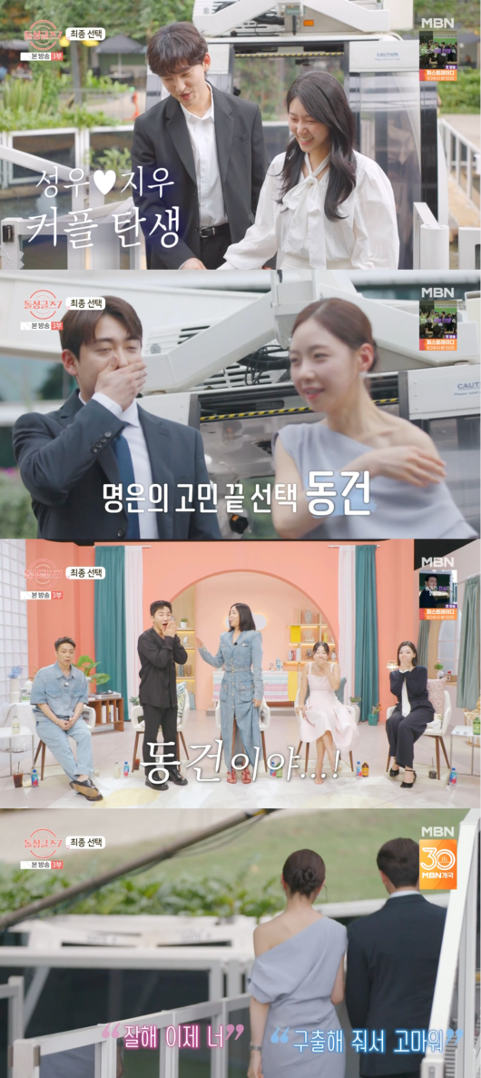 고민 끝에 명은은 "동건 오빠 같이 나가자"라고 말하며 동건을 최종 선택했다. 예상치 못한 결과에 MC들은 "정말 충격적인 결과다"라며 놀라움을 감추지 못했다. 이로써 '돌싱글즈'는 지우♥성우 커플에 이어 명은♥동건 커플까지 총 2쌍의 최종 커플을 탄생시켰다.
