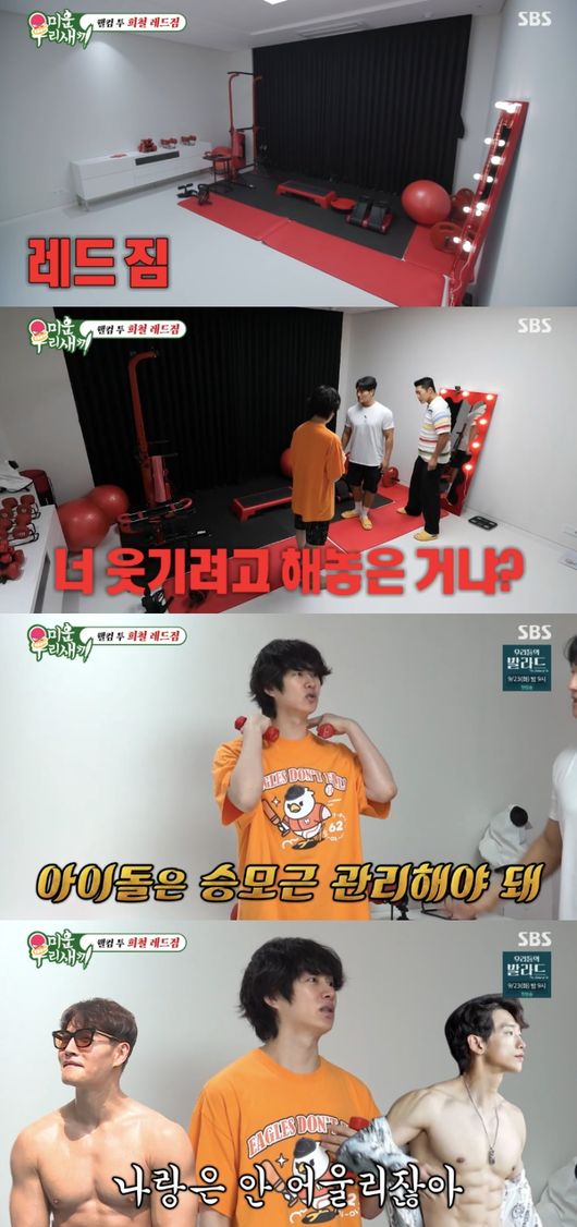 김희철의 홈짐이 공개됐다. 온통 강렬한 레드로 도배된 홈짐 내부에 서장훈은 “저기 그냥 대기실 같다”라고 했고, 김종국은 “너 웃기려고 해 놓은 거냐”라고 반응했다. 하지만 김희철 어머니는 “희철이 그래도 큰 마음 먹은 거다”라고 아들 편을 들었다.