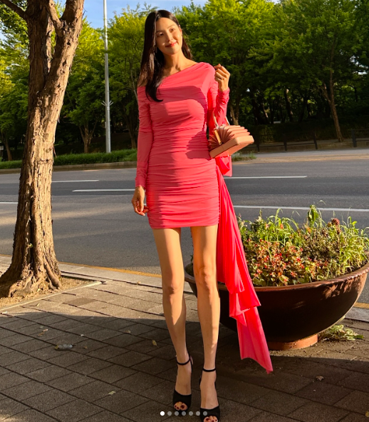 사진 속 한지혜는 핑크색 오프숄더 미니드레스를 입고 길 한복판에 서서 포즈를 취하고 있다. 몸매 라인이 드러나는 옷을 입고도 군살 하나 없는 완벽한 S라인 자태를 과시해 눈길을 끌었다.