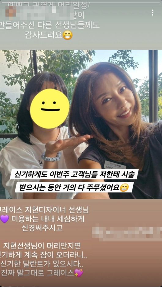 공개된 사진에서 이지현은 자신에게 시술을 받은 고객과 인증샷을 남겼다. 고객은 “미용하는 내내 세심하게 신경 써주시고”, “지현 선생님이 머리 만지면 신기하게 계속 잠이 오더라니 신기한 달란트가 있으시다. 진짜 말 그대로 그레이스”라고 말했다.