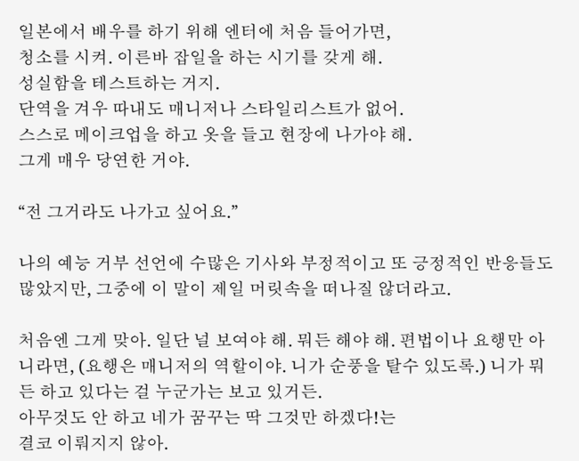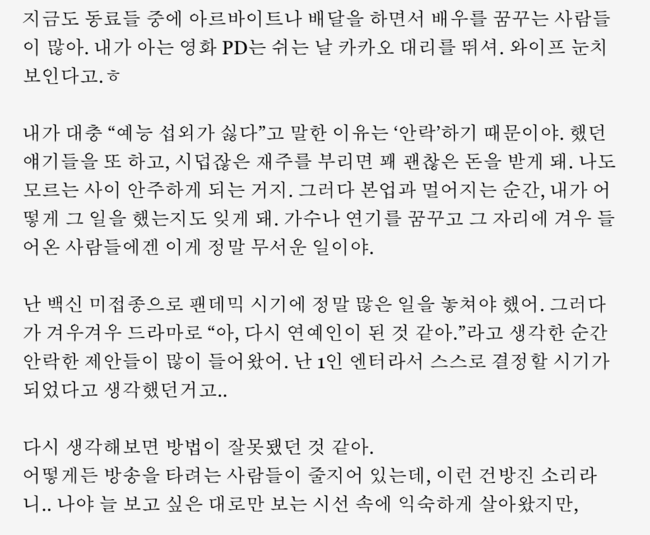 이어 그는 “팬데믹 시기 백신 미접종으로 인해 많은 일을 놓쳤다. 그러다 겨우겨우 드라마로 '다시 연예인이 된 것 같다'고 생각하던 순간, 수많은 안락한 제안이 들어왔다”며 “1인 엔터라서 스스로 결정할 시기가 됐다고 생각했다. 지금 돌이켜보면 방법이 잘못됐던 것 같다. 어떻게든 방송 타려는 사람들이 줄지어 있는데, 이런 건방진 소리라니..”라고 자신을 돌아봤다.
