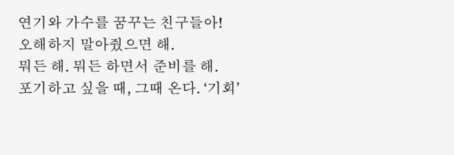김동완은 마지막으로 “연기와 가수를 꿈꾸는 친구들아, 오해하지 말아줬으면 한다. 뭐든 해라. 뭐든 하면서 준비해라. 포기하고 싶을 때, 그때 온다 기회”라고 글을 맺으며 연예계를 준비하는 이들에게 따뜻한 응원의 메시지를 보냈다.