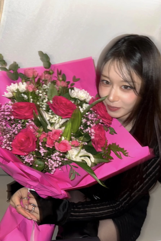 공개된 사진 속 지연은 블랙 시스루 니트를 입고 대형 꽃다발을 들고 카메라를 응시했다. 화려한 핫핑크 포장지 속 장미, 백합, 안개꽃이 어우러진 꽃다발이 지연의 얼굴만큼 크고, 지연은 은은한 미소를 지으며 청순한 분위기를 풍겼다.