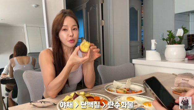 아침식사는 사과, 당근, 고구마, 양배추와 계란, 바나나였다. 미나는 "저희는 식단이지만 많이 먹는다"며 "반은 찌고 반은 생으로 먹는다"고 밝혔다.