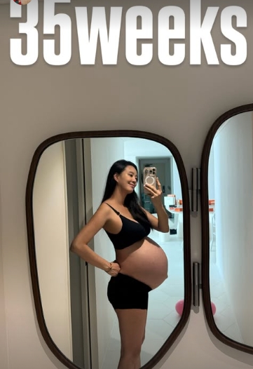지소연이 쌍둥이 출산을 앞두고 임신 35주차의 D라인을 공개했다.